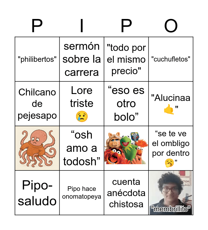 This bingo card has 8 images and 25 words: hace/habla de percu, se molesta por un celular, “eso es otro bolo”, cuenta sobre sus operaciones, "philibertos", sermón sobre la carrera, "todo por el mismo precio", "membrillito", Pipo hace onomatopeya, cuenta anécdota chistosa, "Alucinaa 🤙", Piporopo a las chicas 💋, "ha sido un visto haberlos gusto", "Ambulantes", Chilcano de pejesapo, “osh amo a todosh”, chiste del estornudo, "cuchufletos", Pipo-saludo, pipo acaba la clase tarde, repite el mismo tema, “se te ve el ombligo por dentro 🥱”, Pipo-abrazón🫂, Lore triste 😢 and se saca/pone el collarín.