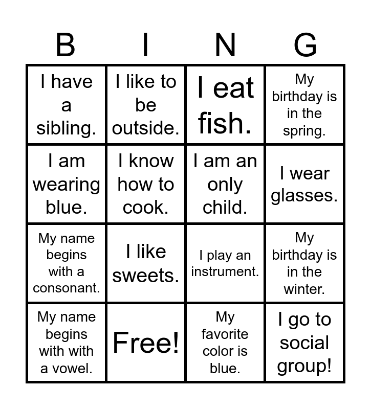This bingo card has 25 words: I have a pet., My birthday is in the summer., I wear glasses., My favorite color is green., I am wearing blue., I have a sibling., I know how to cook., I like to be outside., Free!, I like summer more than winter., My name begins with a consonant., I play an instrument., I am wearing white., I've gone camping., I am an only child., My birthday is in the fall., My favorite color is blue., I eat fish., I like sweets., My birthday is in the winter., My name begins with with a vowel., I like winter more than summer., I go to social group!, My birthday is in the spring. and My favorite color is pink..