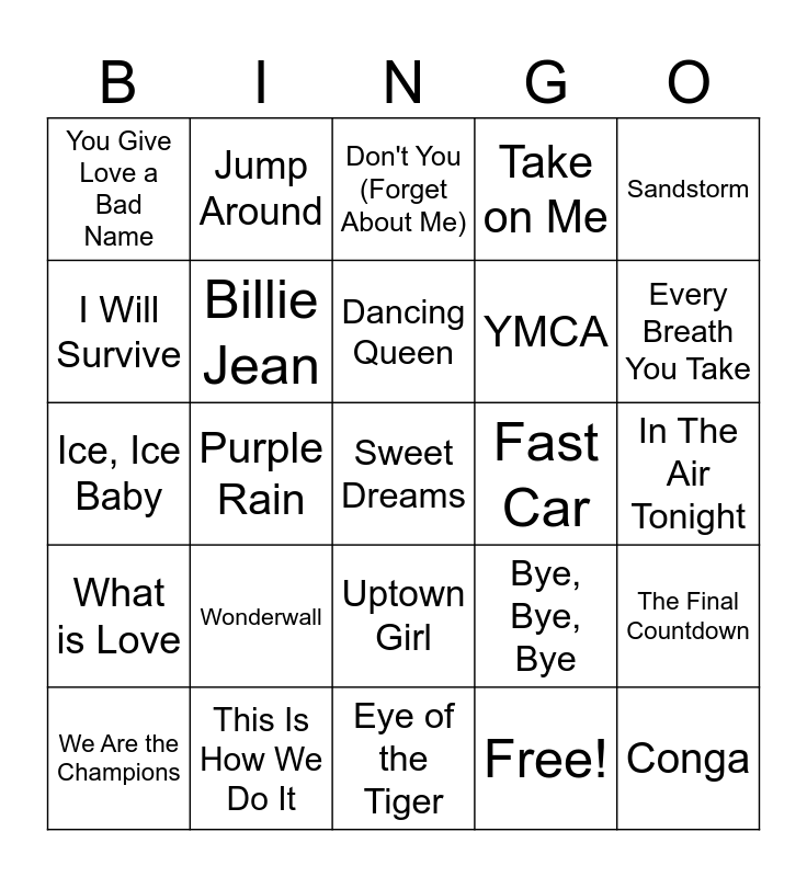 This bingo card has 30 words: This Is How We Do It, Livin on a Prayer, Purple Rain, Don't Stop Believin, You Give Love a Bad Name, Don't You (Forget About Me), Billie Jean, Uptown Girl, Fast Car, Eye of the Tiger, In The Air Tonight, Sweet Dreams, Free!, Conga, Every Breath You Take, Gangsta's Paradise, Bye, Bye, Bye, What is Love, Wonderwall, Sandstorm, Ice, Ice Baby, Waterfalls, Jump Around, YMCA, I Will Survive, Take on Me, The Final Countdown, We Are the Champions, Dancing Queen and September.