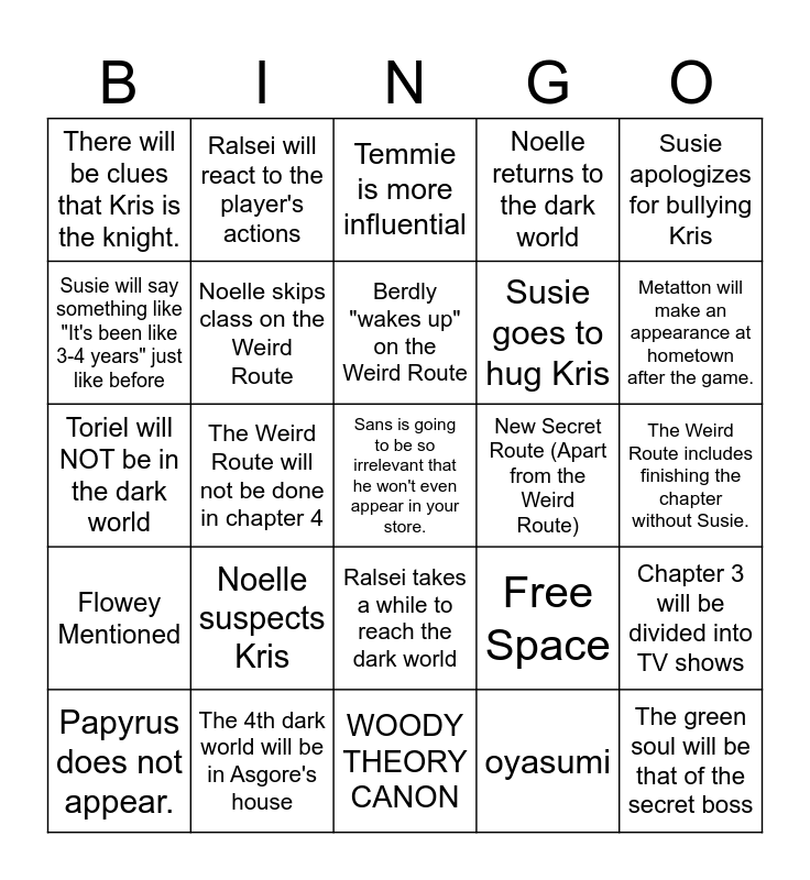 This bingo card has 25 words: Noelle suspects Kris, WOODY THEORY CANON, Berdly "wakes up" on the Weird Route, Papyrus does not appear., Susie apologizes for bullying Kris, There will be clues that Kris is the knight., Susie will say something like "It's been like 3-4 years" just like before, Ralsei will react to the player's actions, New Secret Route (Apart from the Weird Route), Ralsei takes a while to reach the dark world, Susie goes to hug Kris, Toriel will NOT be in the dark world, Free Space, Chapter 3 will be divided into TV shows, Noelle skips class on the Weird Route, The green soul will be that of the secret boss, The Weird Route includes finishing the chapter without Susie., Temmie is more influential, Metatton will make an appearance at hometown after the game., The Weird Route will not be done in chapter 4, Sans is going to be so irrelevant that he won't even appear in your store., The 4th dark world will be in Asgore's house, Flowey Mentioned, Noelle returns to the dark world and oyasumi.