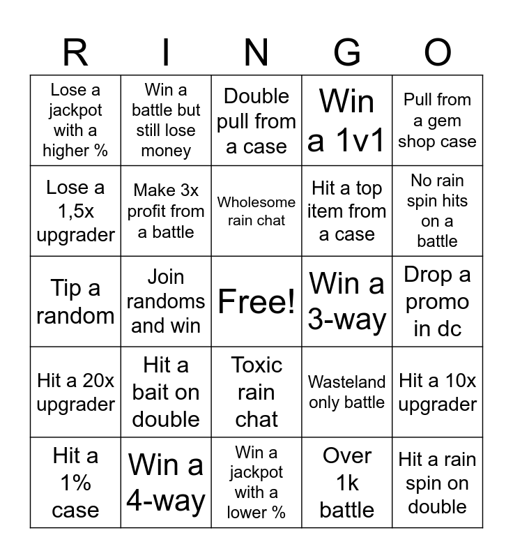 This bingo card has a free space and 24 words: Hit a bait on double, Win a 4-way, Wholesome rain chat, Hit a 1% case, Pull from a gem shop case, Lose a jackpot with a higher %, Lose a 1,5x upgrader, Win a battle but still lose money, Win a 3-way, Toxic rain chat, Hit a top item from a case, Tip a random, Wasteland only battle, Hit a 10x upgrader, Make 3x profit from a battle, Over 1k battle, Drop a promo in dc, Double pull from a case, No rain spin hits on a battle, Join randoms and win, Hit a rain spin on double, Hit a 20x upgrader, Win a 1v1 and Win a jackpot with a lower %.