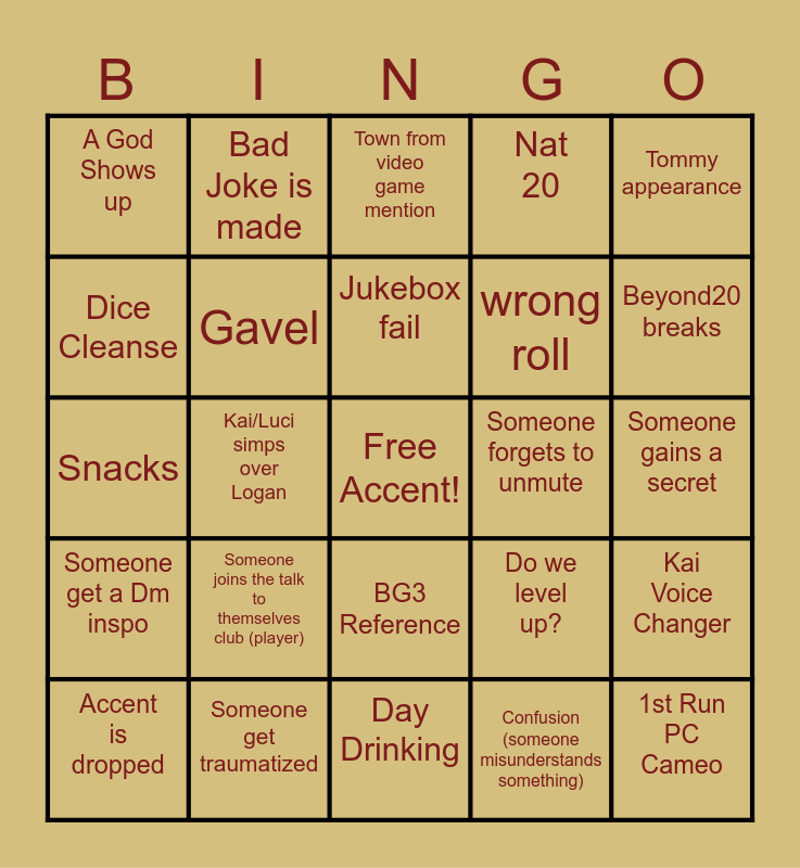 This bingo card has a free space and 36 words: Nay is late, 1st Run is mentioned, EPIC Reference, Gavel, Do we level up?, Someone get a Dm inspo, Jukebox fail, Peter leaves to make dinner, Tommy appearance, Someone Flirts, Kai/Luci simps over Logan, Nat 20, Nat 1, Someone forgets to unmute, Beyond20 breaks, A God Shows up, Ordep threatens someone, Someone joins the talk to themselves club (player), 1st Run PC Cameo, Town from video game mention, Someone gains a secret, Kai Voice Changer, Someone get traumatized, Accent is dropped, Day Drinking, Bad Joke is made, Snacks, secret spell, wrong roll, Dice Cleanse, Discord Falters, "English is hard", Confusion (someone misunderstands something), BG3 Reference, Someone references something that doesn't exist in world and Dimension 20 reference.