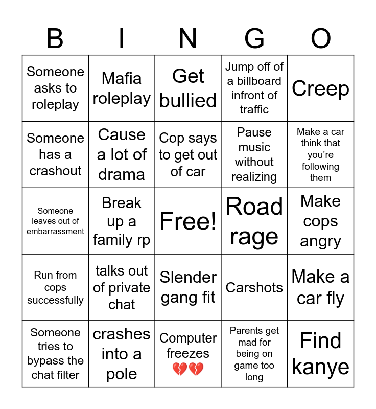 This bingo card has a free space and 24 words: talks out of private chat, crashes into a pole, Cop says to get out of car, Someone tries to bypass the chat filter, Creep, Someone asks to roleplay, Someone has a crashout, Mafia roleplay, Road rage, Slender gang fit, Pause music without realizing, Someone leaves out of embarrassment, Carshots, Make a car fly, Cause a lot of drama, Parents get mad for being on game too long, Make cops angry, Get bullied, Make a car think that you’re following them, Break up a family rp, Find kanye, Run from cops successfully, Jump off of a billboard infront of traffic and Computer freezes💔💔.