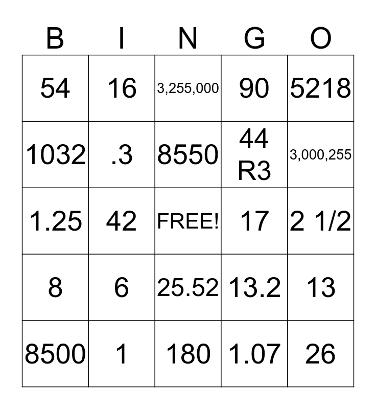 This bingo card has a free space and 24 words: 6, 1, 8550, 8500, 5218, 54, 1032, 16, 17, 25.52, 44 R3, 1.25, 13.2, 13, .3, 1.07, 2 1/2, 3,255,000, 3,000,255, 42, 26, 8, 90 and 180.