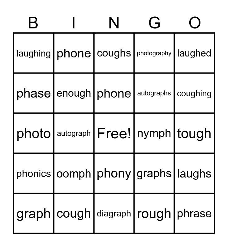 This bingo card has a free space and 24 words: graph, oomph, phone, rough, laughed, laughing, phone, coughs, nymph, tough, photo, enough, graphs, laughs, phase, cough, diagraph, photography, coughing, phonics, autograph, phony, autographs and phrase.