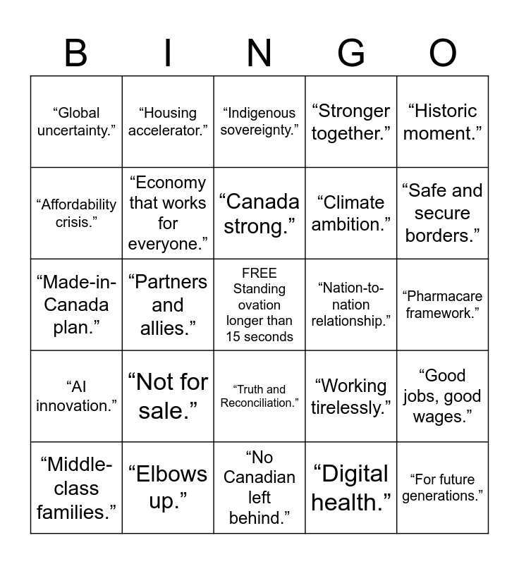 This bingo card has a free space and 24 words: “Not for sale.”, “Elbows up.”, “Canada strong.”, “Middle-class families.”, “Historic moment.”, “Global uncertainty.”, “Affordability crisis.”, “Housing accelerator.”, “Nation-to-nation relationship.”, “Truth and Reconciliation.”, “Climate ambition.”, “Made-in-Canada plan.”, “Working tirelessly.”, “Good jobs, good wages.”, “Economy that works for everyone.”, “Digital health.”, “Pharmacare framework.”, “Indigenous sovereignty.”, “Safe and secure borders.”, “Partners and allies.”, “For future generations.”, “AI innovation.”, “Stronger together.” and “No Canadian left behind.”.