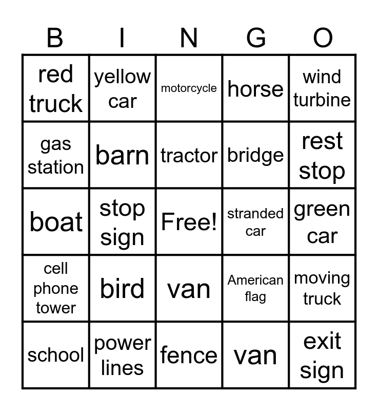 This bingo card has a free space and 29 words: school, cow, stop sign, river, red truck, motorcycle, barn, bird, stranded car, power lines, green car, exit sign, fence, van, rest stop, blue car, van, cell phone tower, wind turbine, boat, American flag, police car, bridge, gas station, horse, yellow car, moving truck, tractor and airplane.