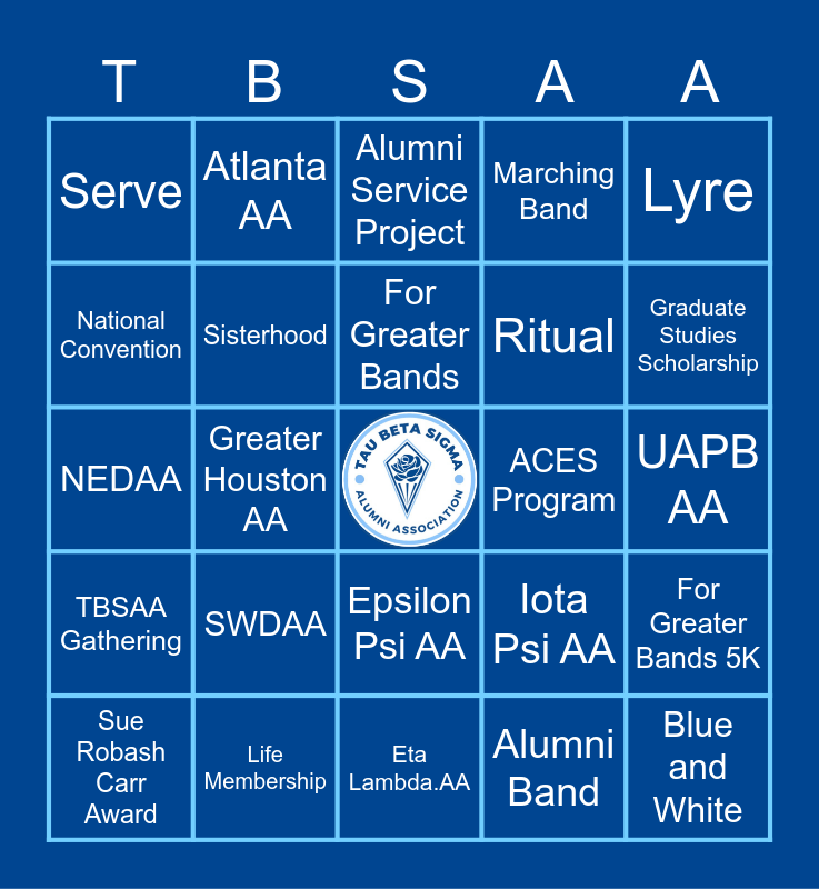 This bingo card has a free space and 59 words: Local Alumni Association, Life Membership, Networking, TBSAA Gathering, Alumni Band, Leadership, Sisterhood, Stillwater Station, Ritual, Connect, Marching Band, Welcome Experience for NIB Participants, National Convention, District Convention, Engage, Serve, Blue and White, Lyre, Wava Banes, For Greater Bands, ACES Program, Alumni Service Project, Sue Robash Carr Award, For Greater Bands 5K, TBSAA Grant Program, Gold Star Club, Standard Membership, LAA-Only Membership, Graduate Studies Scholarship, Professional Development, Networking Opportunities, The Rhapsody, The Entr’Acte, 1946, Atlanta AA, Brave Spirit AA, Columbia AA, Greater Houston AA, MWDAA, NEDAA, SC State ITB AA, SWDAA, UAPB AA, WDAA, Alpha Chapter AA, Alpha Xi AA, Delta Theta AA, Epsilon Omega AA, Epsilon Psi AA, Eta Lambda.AA, Gamma Eta AA, Grambling AA, Greater OKC TBS AA, Highest of Seven Hills AA, Iota Pi AA, Iota Psi AA, Iota Zeta AA, SEDAA and Southern University TBS AA.