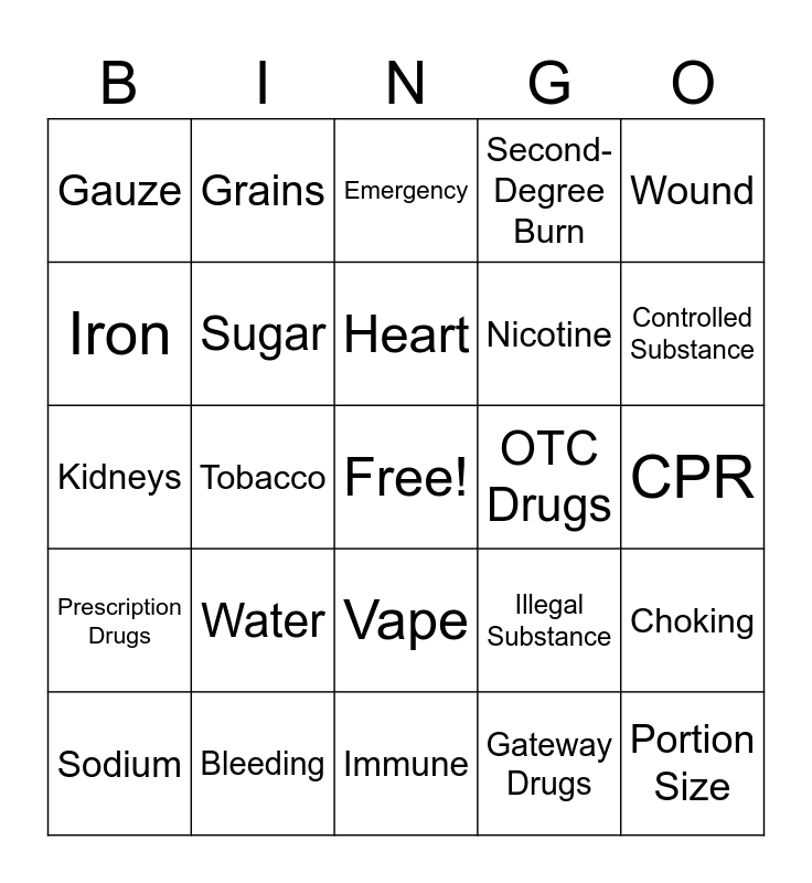 This bingo card has a free space and 70 words: First-Aid, CPR, AED, Bandage, Bleeding, First-Degree Burn, Second-Degree Burn, Third-Degree Burn, Wound, Contusion, Choking, Gloves, Gauze, Emergency, Alcohol, Tobacco, Vape, Nicotine, Marijuana, Prescription Drugs, OTC Drugs, Illegal Substance, Controlled Substance, Addiction, Withdrawal, Overdose, Cravings, Refusal Skills, Gateway Drugs, Fruits, Grains, Vegetables, Protein, Dairy, Calories, Vitamins, Minerals, Carbohydrates, Minerals, Iron, Fats, Water, Portion Size, Serving Size, Energy, Sugar, Sodium, Circulatory, Respiratory, Digestive, Nervous, Muscular, Skeletal, Endocrine, Immune, Reproductive, Heart, Lungs, Bones, Intestines, Kidneys, Remove waste, Sends Signals, Physical Wellness, Social Wellness, Intellectual Wellness, Emotional Wellness, Spiritual Wellness, Environmental Wellness and Occupational Wellness.
