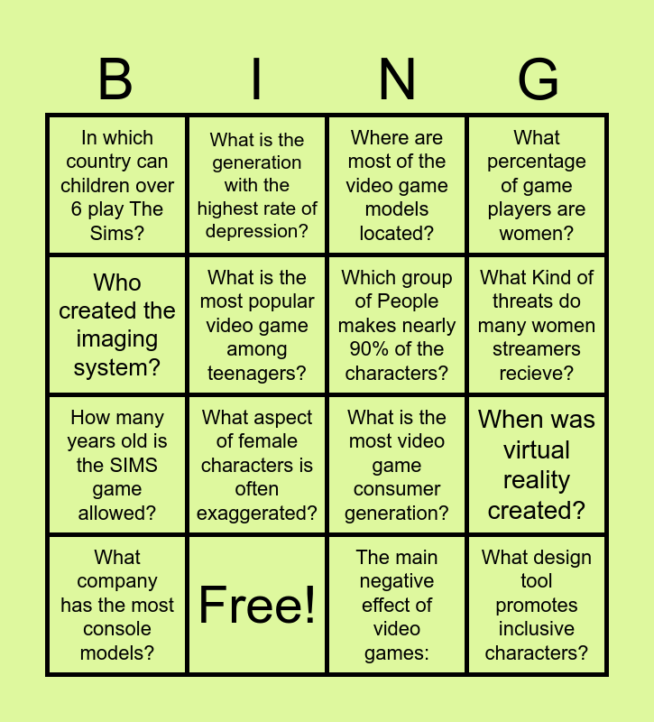 This bingo card has 16 words: Free!, When was virtual reality created?, Where are most of the video game models located?, In which country can children over 6 play The Sims?, How many years old is the SIMS game allowed?, What is the generation with the highest rate of depression?, What is the most video game consumer generation?, The main negative effect of video games:, Who created the imaging system?, What is the most popular video game among teenagers?, What company has the most console models?, What percentage of game players are women?, What aspect of female characters is often exaggerated?, What Kind of threats do many women streamers recieve?, Which group of People makes nearly 90% of the characters? and What design tool promotes inclusive characters?.