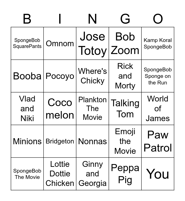 This bingo card has a free space and 24 words: Bridgeton, Lottie Dottie Chicken, Where's Chicky, SpongeBob The Movie, Kamp Koral SpongeBob, SpongeBob SquarePants, Booba, Omnom, Talking Tom, Nonnas, Rick and Morty, Vlad and Niki, Emoji the Movie, Paw Patrol, Pocoyo, Peppa Pig, World of James, Jose Totoy, SpongeBob Sponge on the Run, Coco melon, You, Minions, Bob Zoom and Ginny and Georgia.