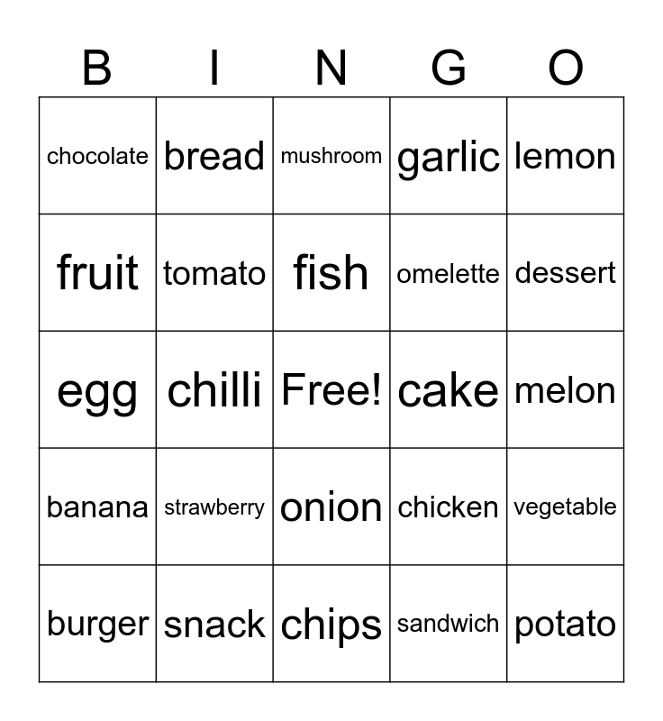 This bingo card has 1 images, a free space and 37 words: apple orange tomato vegetable strawberry fish grape lemon pear chilli garlic potato melon fruit banana carrot mushroom onion cake chocolate dessert burger chips biscuit sandwich bread candy pizza butter sausage snack egg ic, apple, orange, tomato, vegetable, strawberry, fish, grape, lemon, pear, chilli, garlic, potato, melon, fruit, banana, carrot, mushroom, onion, cake, chocolate, dessert, burger, chips, biscuit, sandwich, bread, candy, pizza, butter, sausage, snack, egg, ice cream, chicken, omelette and cheese.