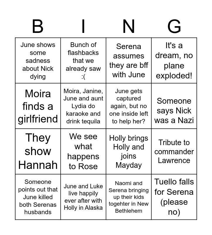 This bingo card has 16 words: June and Luke live happily ever after with Holly in Alaska, Tribute to commander Lawrence, Serena assumes they are bff with June, June shows some sadness about Nick dying, They show Hannah, Bunch of flashbacks that we already saw :(, Holly brings Holly and joins Mayday, Naomi and Serena bringing up their kids togehter in New Bethlehem, Moira finds a girlfriend, Moira, Janine, June and aunt Lydia do karaoke and drink tequila, Someone points out that June killed both Serenas husbands, It's a dream, no plane exploded!, We see what happens to Rose, Someone says Nick was a Nazi, June gets captured again, but no one inside left to help her? and Tuello falls for Serena (please no).