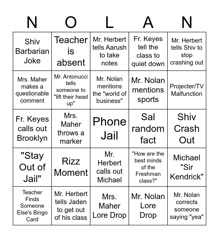 This bingo card has a free space and 24 words: Rizz Moment, Mr. Herbert tells Jaden to get out of his class, Mr. Nolan mentions the "world of business", Teacher Finds Someone Else's Bingo Card, Mr. Herbert tells Shiv to stop crashing out, Shiv Barbarian Joke, Mrs. Maher makes a questionable comment, Teacher is absent, Sal random fact, Mr. Herbert calls out Michael, Mr. Nolan mentions sports, Fr. Keyes calls out Brooklyn, "How are the best minds of the Freshman class?", Michael "Sir Kendrick", Mr. Antonucci tells someone to "lift their head up", Mr. Nolan Lore Drop, Shiv Crash Out, Mr. Herbert tells Aarush to take notes, Projecter/TV Malfunction, Mrs. Maher throws a marker, Mr. Nolan corrects someone saying "yea", "Stay Out of Jail", Fr. Keyes tell the class to quiet down and Mrs. Maher Lore Drop.