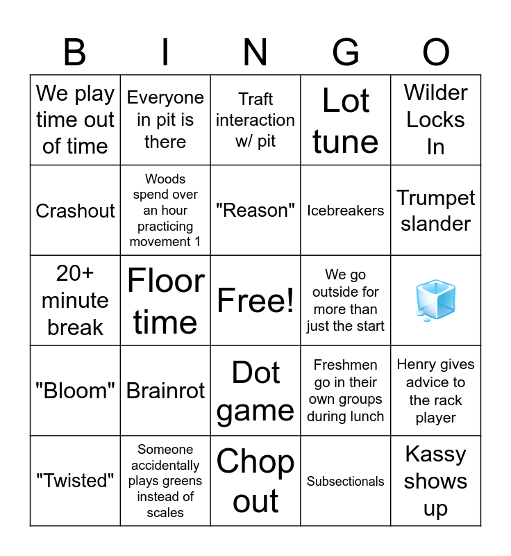 This bingo card has a free space and 24 words: Brainrot, Someone accidentally plays greens instead of scales, "Reason", "Twisted", Wilder Locks In, We play time out of time, Crashout, Everyone in pit is there, We go outside for more than just the start, Dot game, Icebreakers, 20+ minute break, Freshmen go in their own groups during lunch, Henry gives advice to the rack player, Woods spend over an hour practicing movement 1, Subsectionals, 🧊, Traft interaction w/ pit, Trumpet slander, Floor time, Kassy shows up, "Bloom", Lot tune and Chop out.