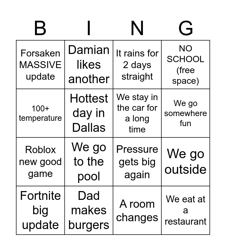 This bingo card has 16 words: Dad makes burgers, We go outside, It rains for 2 days straight, Forsaken MASSIVE update, Roblox new good game, Damian likes another, Pressure gets big again, A room changes, 100+ temperature, Hottest day in Dallas, Fortnite big update, NO SCHOOL (free space), We go to the pool, We go somewhere fun, We stay in the car for a long time and We eat at a restaurant.