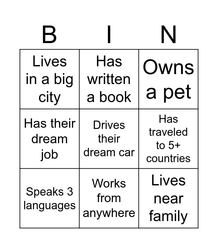 This bingo card has a free space and 8 words: Has traveled to 5+ countries, Owns a pet, Has written a book, Speaks 3 languages, Lives in a big city, Lives near family, Has their dream job and Works from anywhere.