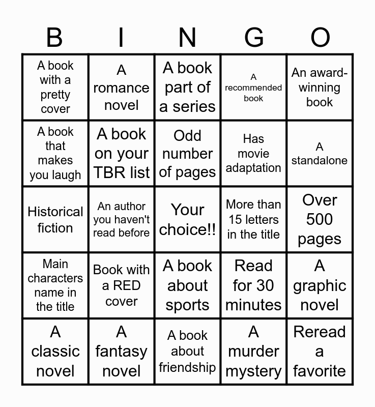 This bingo card has a free space and 24 words: Book with a RED cover, A fantasy novel, Odd number of pages, A classic novel, An award-winning book, A book with a pretty cover, A book that makes you laugh, A romance novel, More than 15 letters in the title, A book about sports, Has movie adaptation, Historical fiction, Read for 30 minutes, A graphic novel, A book on your TBR list, A murder mystery, Over 500 pages, A book part of a series, A standalone, An author you haven't read before, Reread a favorite, Main characters name in the title, A recommended book and A book about friendship.