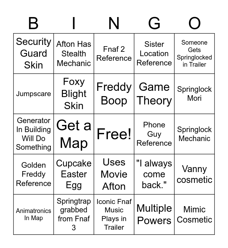 This bingo card has a free space and 24 words: Cupcake Easter Egg, Springtrap grabbed from Fnaf 3, Freddy Boop, Animatronics In Map, Someone Gets Springlocked in Trailer, Security Guard Skin, Jumpscare, Afton Has Stealth Mechanic, Phone Guy Reference, Uses Movie Afton, Game Theory, Generator In Building Will Do Something, "I always come back.", Vanny cosmetic, Foxy Blight Skin, Multiple Powers, Springlock Mechanic, Fnaf 2 Reference, Springlock Mori, Get a Map, Mimic Cosmetic, Golden Freddy Reference, Sister Location Reference and Iconic Fnaf Music Plays in Trailer.