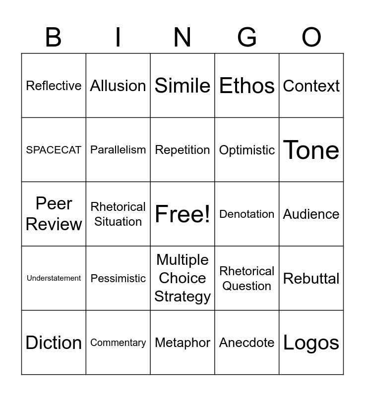 This bingo card has a free space and 60 words: Syntax, Commentary, Kairos, Understatement, Anecdote, Juxtaposition, Parallelism, Speaker, Optimistic, Source Integration, Ethos, Purpose, SPACECAT, Satire, Revision, Reflective, Logos, Context, Claim, Repetition, Denotation, Simile, Diction, Rebuttal, Irony, Concession, Rhetorical Triangle, Evidence, Tone, Imagery, Candid, Counterargument, Anaphora, Didactic, Allusion, Prompt Analysis, Solemn, Rhetorical Situation, Pathos, Peer Review, Message, Pessimistic, Audience, Line of Reasoning, Rhetorical Question, Thesis Statement, Hyperbole, Critical, Rhetorical Analysis Essay, Multiple Choice Strategy, Metaphor, Connotation, Synthesis, Ironic, Occasion, Humorous, Sarcastic, Exigence, SOAPS and Thesis.