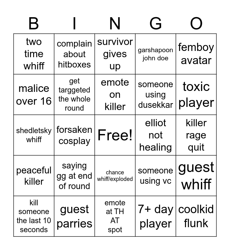 This bingo card has a free space and 24 words: saying gg at end of round, guest parries, emote on killer, kill someone the last 10 seconds, femboy avatar, two time whiff, malice over 16, complain about hitboxes, elliot not healing, chance whiff/exploded, someone using dusekkar, shedletsky whiff, someone using vc, guest whiff, get targgeted the whole round, 7+ day player, killer rage quit, survivor gives up, toxic player, forsaken cosplay, coolkid flunk, peaceful killer, garshapoon john doe and emote at THAT spot.