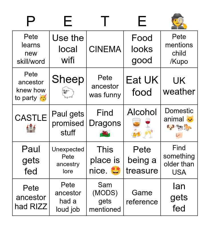 This bingo card has a free space and 24 words: Unexpected Pete ancestry lore, Pete ancestor had a loud job, Pete ancestor was funny, Pete ancestor had RIZZ, Pete mentions child /Kupo, Pete learns new skill/word, Pete ancestor knew how to party π₯³, Use the local wifi, Alcohol π₯π·π»π₯, This place is nice. π€©, Eat UK food, CASTLE π°, Pete being a treasure, Find something older than USA, Sheep π, Game reference, Domestic animal π±πΆπππ, CINEMA, UK weather, Paul gets promised stuff, Ian gets fed, Paul gets fed, Food looks good and Sam (MODS) gets mentioned.
