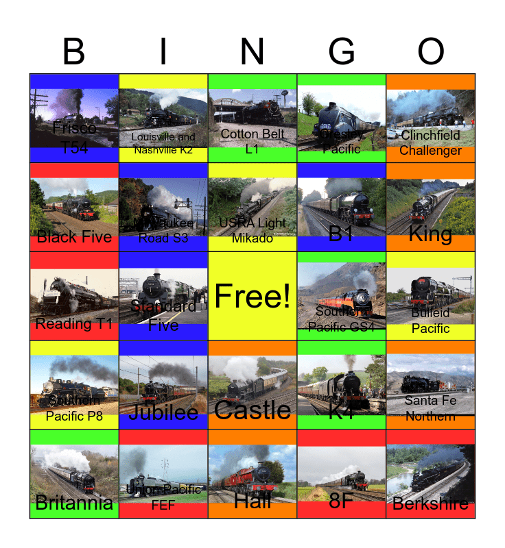 This bingo card has 24 images, a free space and 24 words: Jubilee, Union Pacific FEF, USRA Light Mikado, Britannia, Clinchfield Challenger, Frisco T54, Black Five, Louisville and Nashville K2, Southern Pacific GS4, Castle, B1, Reading T1, K4, Santa Fe Northern, Milwaukee Road S3, 8F, Bulleid Pacific, Cotton Belt L1, King, Standard Five, Berkshire, Southern Pacific P8, Gresley Pacific and Hall.