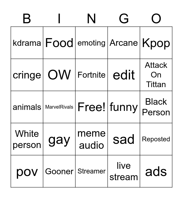 This bingo card has a free space and 24 words: gay, Gooner, Fortnite, pov, Kpop, kdrama, cringe, Food, funny, meme audio, edit, animals, sad, Reposted, OW, live stream, Black Person, emoting, Attack On Tittan, MarvelRivals, ads, White person, Arcane and Streamer.