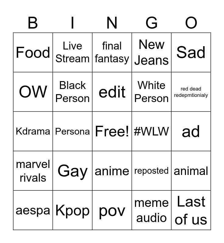 This bingo card has a free space and 24 words: Gay, Kpop, edit, aespa, Sad, Food, OW, Live Stream, #WLW, anime, White Person, Kdrama, reposted, animal, Black Person, meme audio, ad, final fantasy, red dead redepmtionialy, Persona, Last of us, marvel rivals, New Jeans and pov.