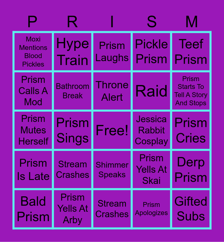 This bingo card has a free space and 34 words: Wishbone Drama, Prism Apologizes, Scuff, Prism Hiccups, Prism Is Late, Bathroom Break, Teef Prism, Bald Prism, Hype Train, Prism Edges Her Pee, Throne Alert, Prism Laughs, Prism Forgets, Prism Yells At Sakutian, Jessica Rabbit Cosplay, Prism Starts To Tell A Story And Stops, Prism Yells At Arby, Prism Mutes Herself, Stream Crashes, Prism Yells At Skai, Shimmer Speaks, Unicorn Snacks, Moxi Mentions Blood Pickles, Prism Cries, Stream Crashes, Gifted Subs, Pickle Prism, Mullet Prism, Raid, Prism Calls A Mod, Prism Calls A Friend, Prism Sings, Derp Prism and Prism Talks About A Kink/Fetish.