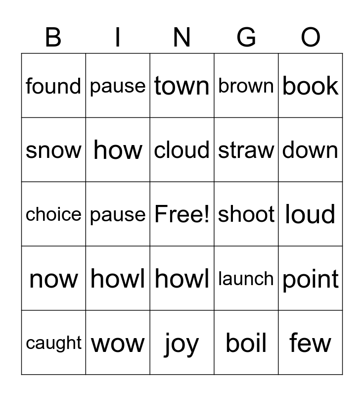 This bingo card has a free space and 24 words: caught, howl, cloud, boil, book, found, pause, town, shoot, loud, choice, how, launch, point, snow, wow, joy, brown, down, now, pause, howl, straw and few.