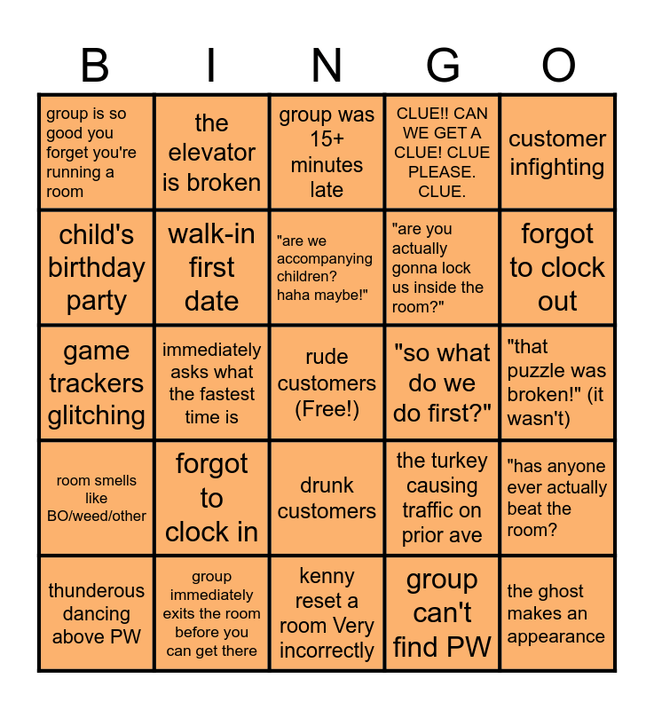 This bingo card has a free space and 24 words: forgot to clock in, group immediately exits the room before you can get there, "are we accompanying children? haha maybe!", thunderous dancing above PW, customer infighting, group is so good you forget you're running a room, child's birthday party, the elevator is broken, "so what do we do first?", drunk customers, "are you actually gonna lock us inside the room?", game trackers glitching, the turkey causing traffic on prior ave, "has anyone ever actually beat the room?, walk-in first date, group can't find PW, "that puzzle was broken!" (it wasn't), group was 15+ minutes late, forgot to clock out, immediately asks what the fastest time is, the ghost makes an appearance, room smells like BO/weed/other, CLUE!! CAN WE GET A CLUE! CLUE PLEASE. CLUE. and kenny reset a room Very incorrectly.