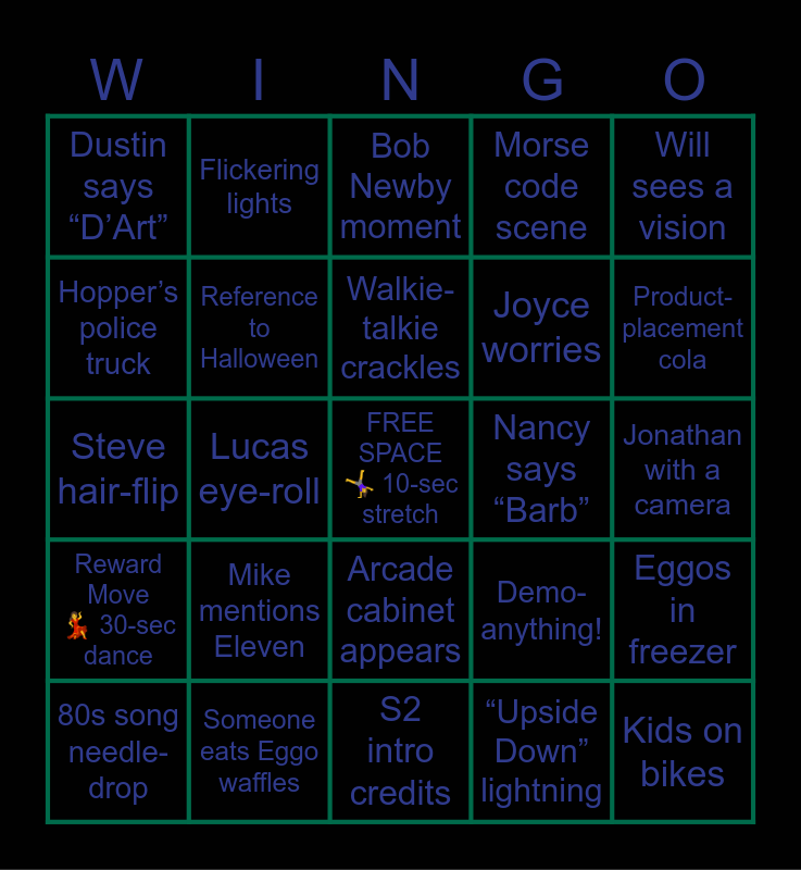 This bingo card has a free space and 24 words: Mike mentions Eleven, Someone eats Eggo waffles, Walkie-talkie crackles, 80s song needle-drop, Will sees a vision, Dustin says “D’Art”, Hopper’s police truck, Flickering lights, Nancy says “Barb”, Arcade cabinet appears, Joyce worries, Steve hair-flip, Demo-anything!, Eggos in freezer, Reference to Halloween, “Upside Down” lightning, Jonathan with a camera, Bob Newby moment, Product-placement cola, Lucas eye-roll, Kids on bikes, Reward Move 💃 30-sec dance, Morse code scene and S2 intro credits.