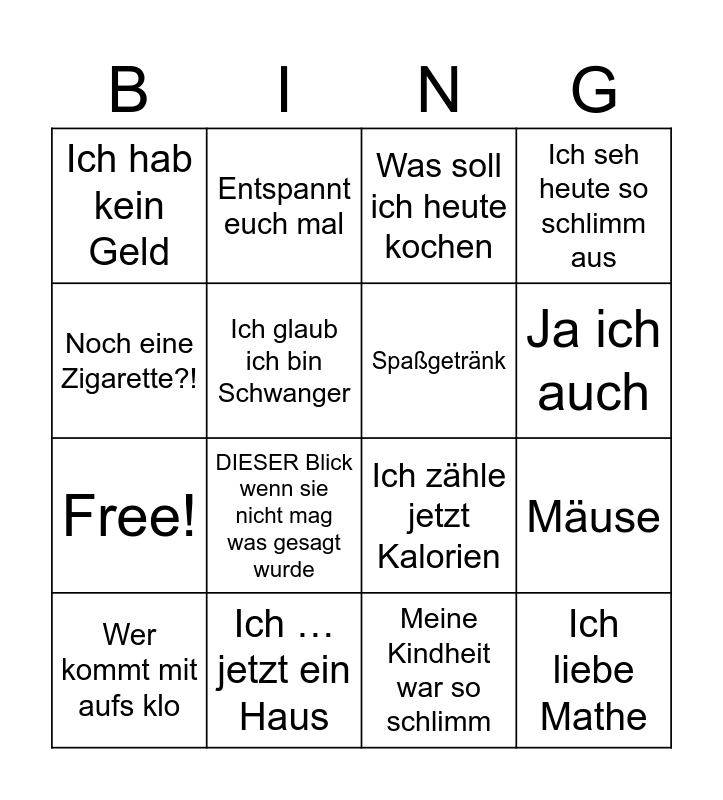 This bingo card has 20 words: Mäuse, Ihr seid voll laut, Was soll ich heute kochen, Mein Freund (angeben oder beschweren), Wer kommt mit aufs klo, Noch eine Zigarette?!, Ich … jetzt ein Haus, Ich hab kein Geld, Free!, Entspannt euch mal, DIESER Blick wenn sie nicht mag was gesagt wurde, Ich zähle jetzt Kalorien, Ich glaub ich bin Schwanger, Ich liebe Mathe, Spaßgetränk, Dm stories, Ja ich auch, Ich seh heute so schlimm aus, Meine Kindheit war so schlimm and Herablassender Kommentar.
