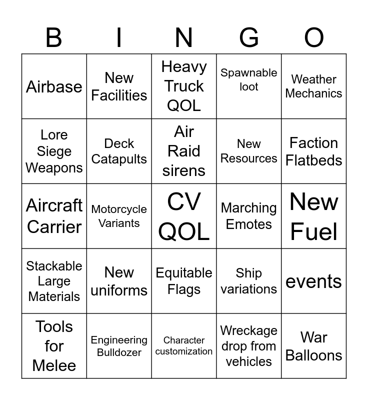 This bingo card has 25 words: New uniforms, Character customization, Air Raid sirens, Tools for Melee, Weather Mechanics, Airbase, Lore Siege Weapons, New Facilities, Marching Emotes, Equitable Flags, New Resources, Aircraft Carrier, Ship variations, events, Deck Catapults, War Balloons, New Fuel, Heavy Truck QOL, Faction Flatbeds, Motorcycle Variants, CV QOL, Engineering Bulldozer, Stackable Large Materials, Spawnable loot and Wreckage drop from vehicles.