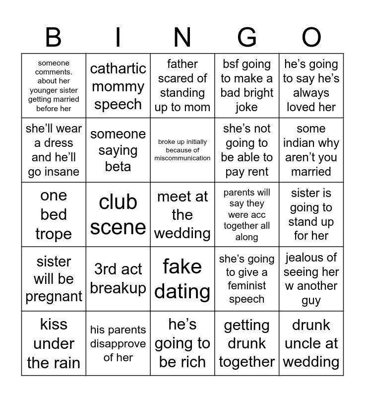 This bingo card has a free space and 24 words: kiss under the rain, 3rd act breakup, broke up initially because of miscommunication, getting drunk together, he’s going to say he’s always loved her, someone comments. about her younger sister getting married before her, cathartic mommy speech, father scared of standing up to mom, parents will say they were acc together all along, sister is going to stand up for her, one bed trope, someone saying beta, she’s going to give a feminist speech, jealous of seeing her w another guy, she’ll wear a dress and he’ll go insane, his parents disapprove of her, he’s going to be rich, bsf going to make a bad bright joke, some indian why aren’t you married, sister will be pregnant, club scene, fake dating, she’s not going to be able to pay rent and drunk uncle at wedding.