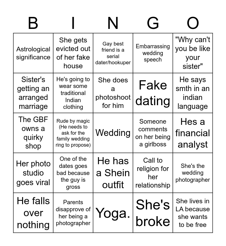 This bingo card has a free space and 24 words: One of the dates goes bad because the guy is gross, Parents disapprove of her being a photographer, She does a photoshoot for him, He falls over nothing, "Why can't you be like your sister", Astrological significance, Sister's getting an arranged marriage, She gets evicted out of her fake house, Someone comments on her being a girlboss, He has a Shein outfit, Fake dating, The GBF owns a quirky shop, Call to religion for her relationship, She's the wedding photographer, He's going to wear some traditional Indian clothing, She's broke, Hes a financial analyst, Gay best friend is a serial dater/hookuper, He says smth in an indian language, Rude by magic (He needs to ask for the family wedding ring to propose), She lives in LA because she wants to be free, Her photo studio goes viral, Embarrassing wedding speech and Yoga..