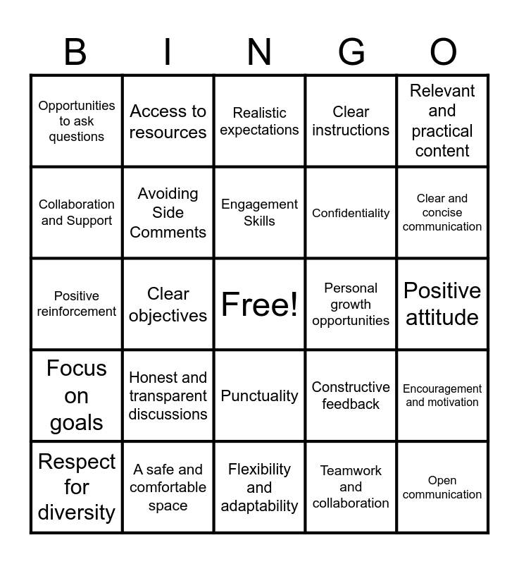 This bingo card has a free space and 44 words: Professional behavior, Open communication, Active participation, Respect for diversity, Encouragement to share ideas, Teamwork and collaboration, Realistic expectations, Constructive criticism, Relevant and practical content, A safe and comfortable space, Clear instructions, Personal growth opportunities, Punctuality, Honest and transparent discussions, Clear objectives and outcomes, Flexibility and adaptability, Mutual support, Positive reinforcement, Opportunities for questions, Clear and concise communication, Access to resources, Minimal distractions, Fun and engaging activities, Opportunities to ask questions, Confidentiality, Positive attitude, Respect for time limits, Respect for opinions, Constructive feedback, Focus on goals, Effective time management, Encouragement and motivation, Inclusive environment, Relevant content, Clear objectives, Respectful Behavior, Preparedness, Responsiveness to Questions, Engagement Skills, Collaboration and Support, Confidentiality, Punctuality and Attendance, Avoiding Side Comments and Willingness to Share.