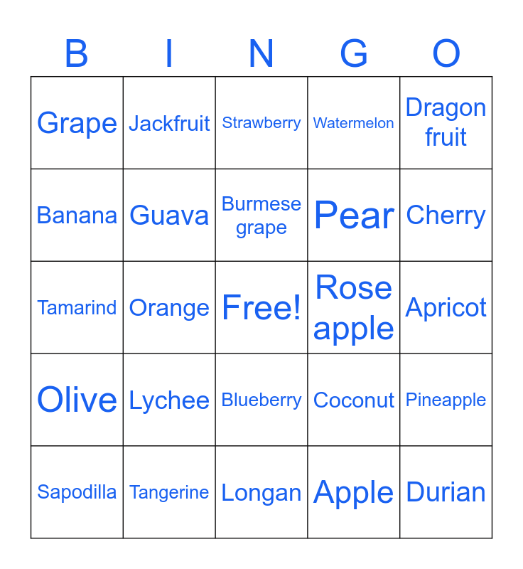This bingo card has a free space and 50 words: Mango, Durian, Mangosteen, Longan, Lychee, Pomelo, Jackfruit, Rambutan, Banana, Papaya, Guava, Watermelon, Pineapple, Coconut, Star gooseberry, Bilimbi, Burmese grape, Rose apple, Custard apple, Dragon fruit, Orange, Apple, Grape, Pear, Peach, Plum, Cherry, Kiwi, Strawberry, Blueberry, Raspberry, Blackberry, Lemon, Lime, Tangerine, Passion fruit, Fig, Pomegranate, Persimmon, Apricot, Nectarine, Cranberry, Avocado, Starfruit (Carambola), Sapodilla, Tamarind, Gooseberry, Date, Olive and Cantaloupe.
