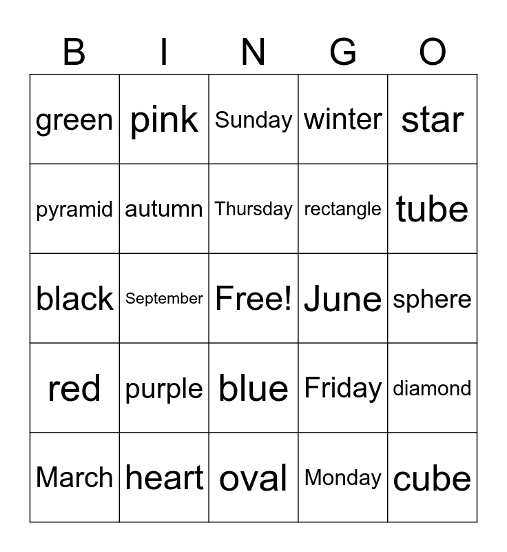 This bingo card has a free space and 25 words: purple, oval, Thursday, March, star, green, pyramid, pink, June, blue, rectangle, black, Friday, diamond, autumn, orange, sphere, Sunday, tube, September, cube, heart, red, winter and Monday.