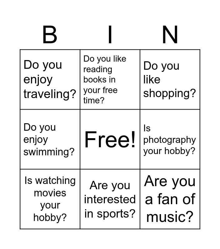 This bingo card has a free space and 8 words: Do you enjoy swimming?, Do you like reading books in your free time?, Is photography your hobby?, Is watching movies your hobby?, Do you like shopping?, Do you enjoy traveling?, Are you interested in sports? and Are you a fan of music?.