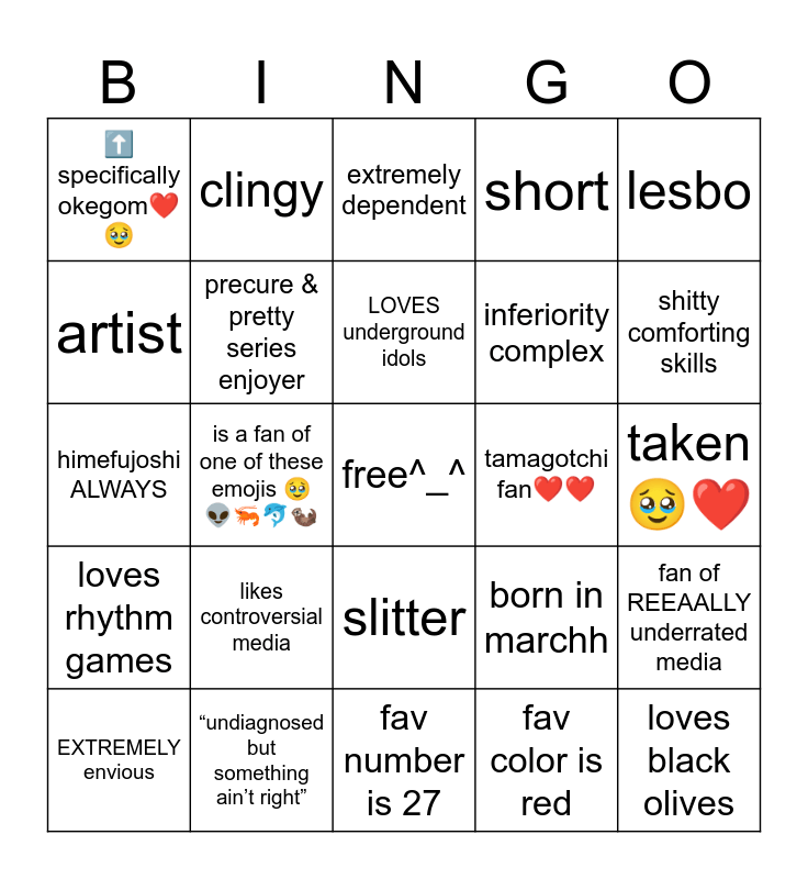 This bingo card has a free space and 24 words: likes controversial media, “undiagnosed but something ain’t right”, LOVES underground idols, EXTREMELY envious, lesbo, ⬆️ specifically okegom❤️🥹, artist, clingy, tamagotchi fan❤️❤️, slitter, inferiority complex, himefujoshi ALWAYS, born in marchh, fan of REEAALLY underrated media, precure & pretty series enjoyer, fav color is red, taken🥹❤️, extremely dependent, shitty comforting skills, is a fan of one of these emojis 🥹👽🦐🐬🦦, loves black olives, loves rhythm games, short and fav number is 27.
