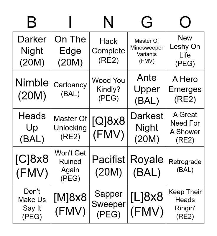 This bingo card has 25 words: Won't Get Ruined Again (PEG), Sapper Sweeper (PEG), Wood You Kindly? (PEG), Don't Make Us Say It (PEG), New Leshy On Life (PEG), Darker Night (20M), Nimble (20M), On The Edge (20M), Darkest Night (20M), Pacifist (20M), Ante Upper (BAL), Heads Up (BAL), Royale (BAL), Retrograde (BAL), Cartoancy (BAL), Keep Their Heads Ringin' (RE2), A Great Need For A Shower (RE2), Hack Complete (RE2), A Hero Emerges (RE2), Master Of Unlocking (RE2), [Q]8x8 (FMV), [M]8x8 (FMV), [C]8x8 (FMV), Master Of Minesweeper Variants (FMV) and [L]8x8 (FMV).
