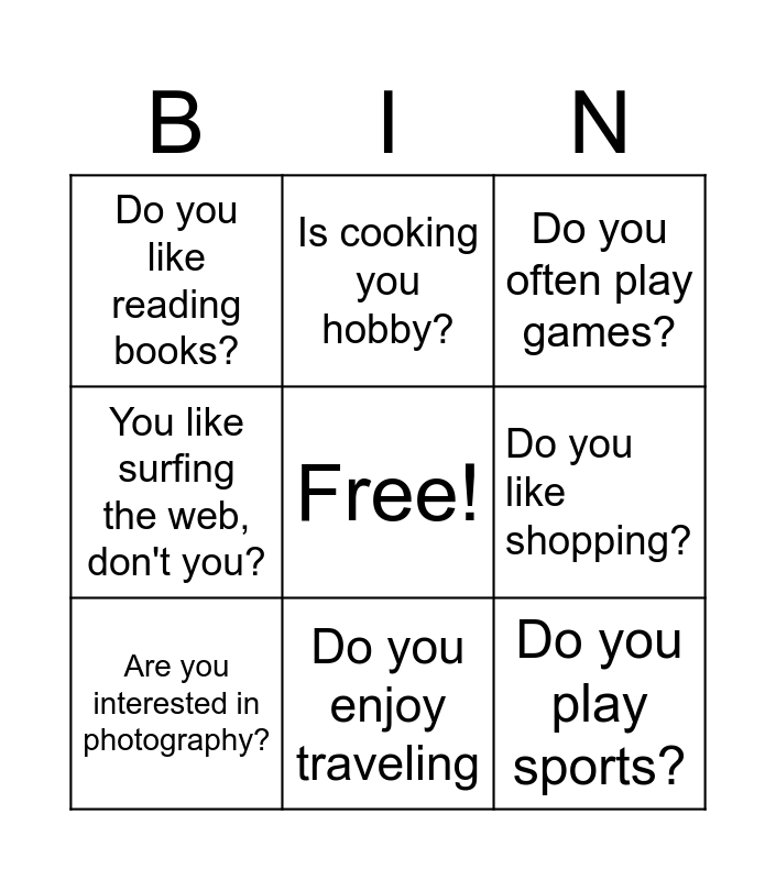 This bingo card has a free space and 8 words: Do you like shopping?, Do you often play games?, Is cooking you hobby?, Are you interested in photography?, Do you like reading books?, Do you play sports?, You like surfing the web, don't you? and Do you enjoy traveling.