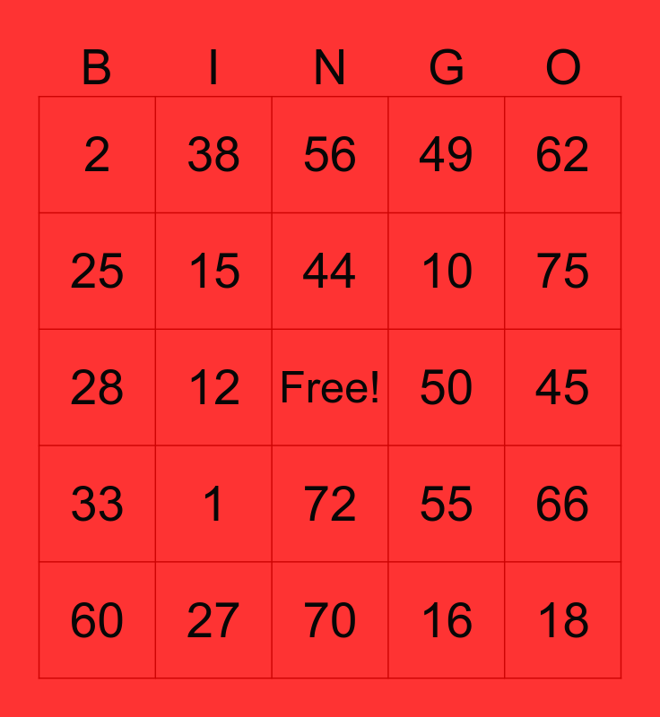 This bingo card has a free space and 24 words: 1, 27, 44, 60, 62, 2, 25, 38, 50, 72, 10, 28, 55, 66, 15, 16, 45, 56, 75, 12, 18, 33, 49 and 70.