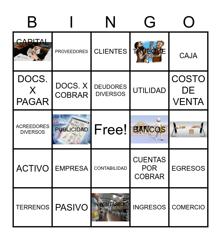 This bingo card has 6 images, a free space and 24 words: ACTIVO, PASIVO, INVENTARIOS, INGRESOS, CAJA, CAPITAL, PROVEEDORES, CLIENTES, BANCOS, EGRESOS, DOCS. X PAGAR, DOCS. X COBRAR, CUENTAS POR PAGAR, CUENTAS POR COBRAR, COSTO DE VENTA, TERRENOS, PUBLICIDAD, DEUDORES DIVERSOS, UTILIDAD, ACREEDORES DIVERSOS, EMPRESA, CONTABILIDAD, TRUEQUE and COMERCIO.