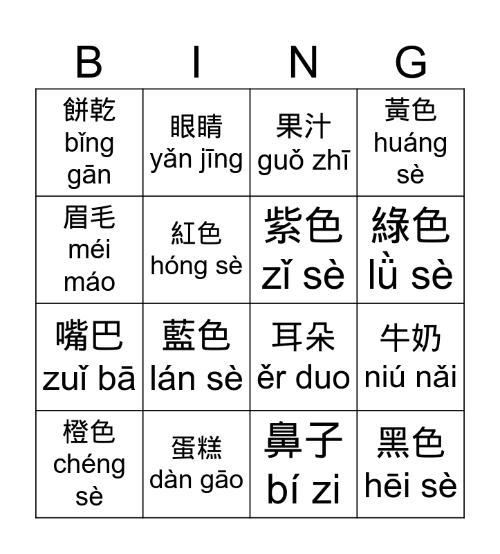 This bingo card has 16 words: 蛋糕dàn gāo, 牛奶 niú nǎi, 果汁 guǒ zhī, 餅乾 bǐng gān, 嘴巴 zuǐ bā, 眼睛 yǎn jīng, 耳朵 ěr duo, 鼻子 bí zi, 眉毛 méi máo, 紅色 hóng sè, 橙色 chéng sè, 黃色 huáng sè, 藍色 lán sè, 綠色 lǜ sè, 紫色 zǐ sè and 黑色 hēi sè.
