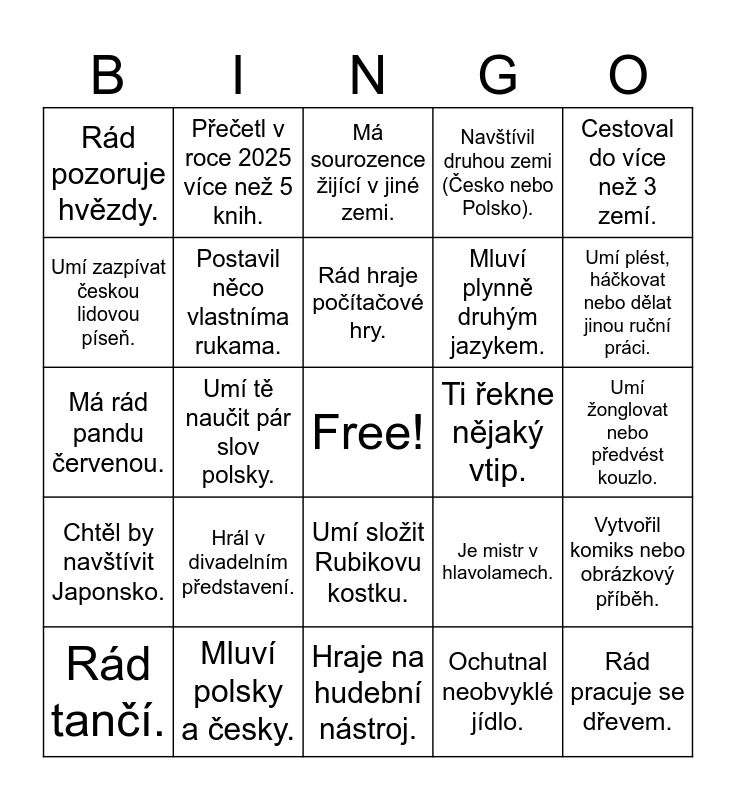 This bingo card has a free space and 24 words: Hrál v divadelním představení., Mluví polsky a česky., Rád hraje počítačové hry., Rád tančí., Cestoval do více než 3 zemí., Rád pozoruje hvězdy., Umí zazpívat českou lidovou píseň., Přečetl v roce 2025 více než 5 knih., Ti řekne nějaký vtip., Umí složit Rubikovu kostku., Mluví plynně druhým jazykem., Má rád pandu červenou., Je mistr v hlavolamech., Vytvořil komiks nebo obrázkový příběh., Postavil něco vlastníma rukama., Ochutnal neobvyklé jídlo., Umí žonglovat nebo předvést kouzlo., Má sourozence žijící v jiné zemi., Umí plést, háčkovat nebo dělat jinou ruční práci., Umí tě naučit pár slov polsky., Rád pracuje se dřevem., Chtěl by navštívit Japonsko., Navštívil druhou zemi (Česko nebo Polsko). and Hraje na hudební nástroj..