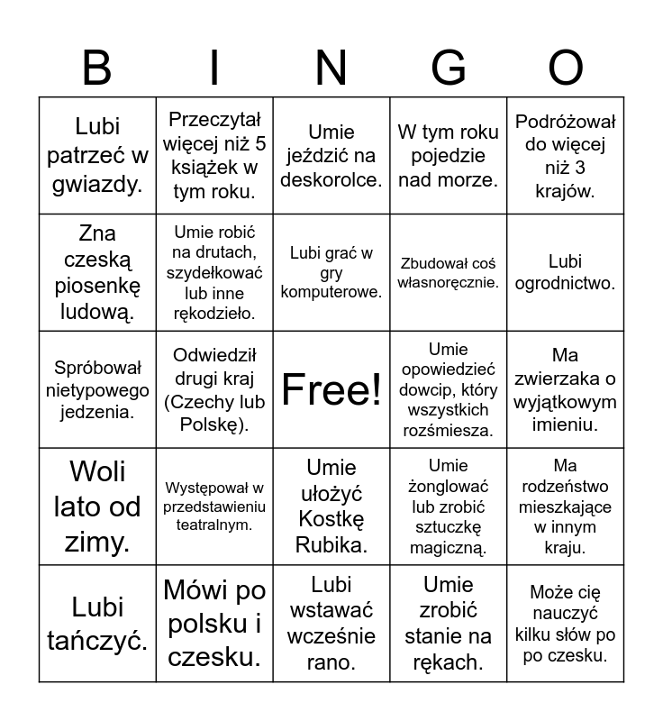 This bingo card has a free space and 24 words: Występował w przedstawieniu teatralnym., Mówi po polsku i czesku., Lubi grać w gry komputerowe., Lubi tańczyć., Podróżował do więcej niż 3 krajów., Lubi patrzeć w gwiazdy., Zna czeską piosenkę ludową., Przeczytał więcej niż 5 książek w tym roku., Umie opowiedzieć dowcip, który wszystkich rozśmiesza., Umie ułożyć Kostkę Rubika., Zbudował coś własnoręcznie., Spróbował nietypowego jedzenia., Umie żonglować lub zrobić sztuczkę magiczną., Ma rodzeństwo mieszkające w innym kraju., Umie robić na drutach, szydełkować lub inne rękodzieło., Umie zrobić stanie na rękach., Ma zwierzaka o wyjątkowym imieniu., Umie jeździć na deskorolce., Lubi ogrodnictwo., Odwiedził drugi kraj (Czechy lub Polskę)., Może cię nauczyć kilku słów po po czesku., Woli lato od zimy., W tym roku pojedzie nad morze. and Lubi wstawać wcześnie rano..