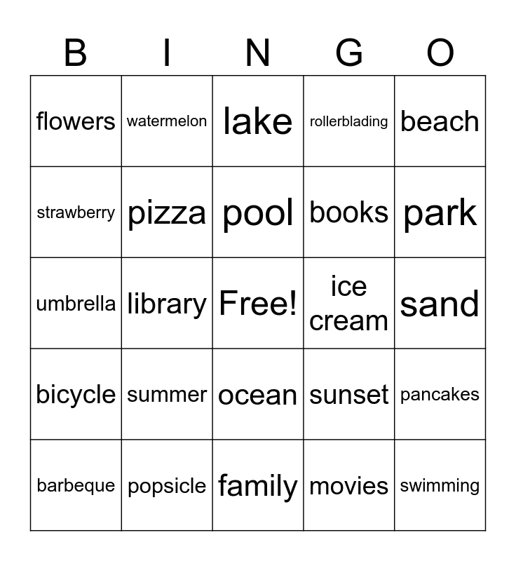 This bingo card has a free space and 24 words: summer, popsicle, pool, barbeque, beach, flowers, strawberry, watermelon, ice cream, ocean, books, umbrella, sunset, pancakes, pizza, movies, sand, lake, park, library, swimming, bicycle, rollerblading and family.